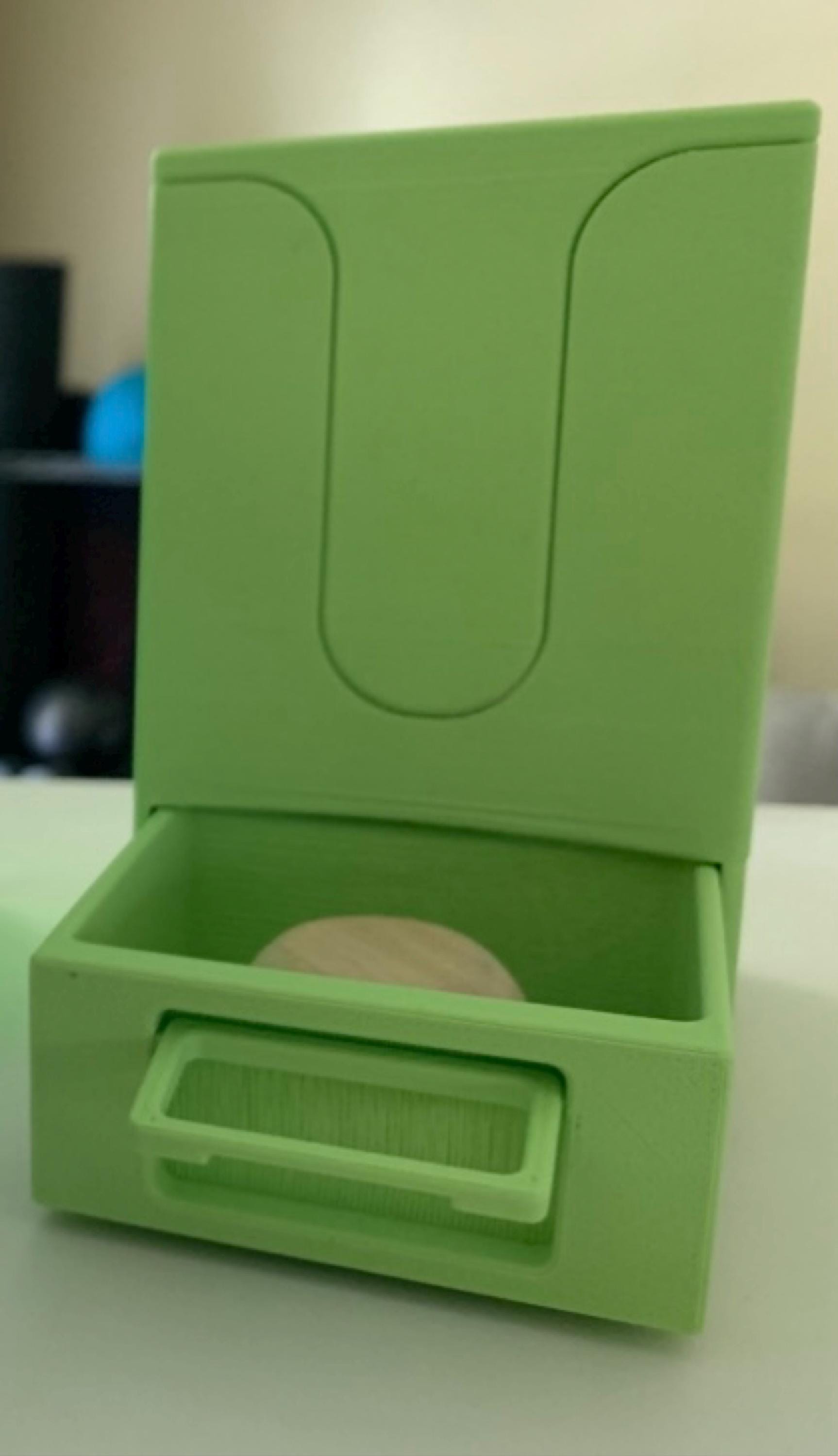 Part 2 of the same order—Here’s the green glow MTG Card Deck. Rob reached out very quickly and was very responsive in communicating about the deck. He made adjustments based on some needs we had as well as his design ideas. The top holds pretty well with magnets. It was a great experience buying this custom deck from Rob. Shipping was fast and very well packaged. I will be coming back to Rob for future 3D prints.